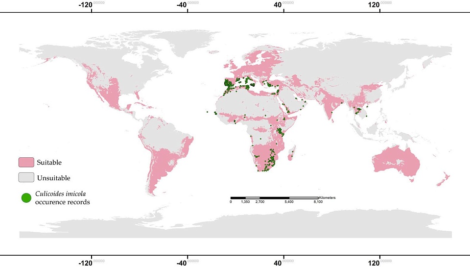 Мошки широко распространены в различных экосистемах и играют значительную роль в распространении трансмиссивных инфекционных заболеваний. Определенные виды мошек рода Culicoides являются переносчиками арбовирусов, представляющих опасность для здоровья как животных, так и человека. В частности, Culicoides imicola выступает в качестве основного переносчика вируса блютанга (BTV). Эти кровососущие мошки представляют собой мелких насекомых, которые имеют широкое распространение по всему миру и размножаются в разнообразных полуводных средах, включая дупла деревьев, берега водоемов, гниющую влажную почву и навоз некоторых травоядных животных. Как и в случае с комарами, самки мошек нуждаются в крови для откладывания яиц. В зависимости от вида, они могут питаться кровью млекопитающих и/или птиц. Несмотря на то, что их способность к активному полету ограничена несколькими сотнями метров, кровососущие мошки могут пассивно переноситься на значительные расстояния с помощью ветра, что значительно увеличивает их влияние на эпидемиологию различных заболеваний. Ранее считалось, что данный вид кровососущих насекомых относится к африканской фауне и имеет широкое распространение преимущественно в странах Африки, а также иногда встречается в Индии и Китае. Однако исследования, начатые в 1990-х годах, выявили значительное расширение ареала данного вида на север. В частности, он был обнаружен в бассейне Средиземного моря. Экспансия Culicoides imicola привела к его распространению в новых ареалах, которые могут существенно отличаться от его естественного биотопа. Инвазивный вид (или не местный) — это организм, не являющийся эндемичным для конкретного географического региона и способный нанести значительный ущерб глобальному биоразнообразию, экономической системе, здоровью человека и животных. Несмотря на широкое применение моделирования экологических ниш для прогнозирования и анализа потенциальной географической экспансии инвазивных видов, исследования, посвященные специфике ниш C. imicola до настоящего времени не проводились. Целью настоящего исследования являлась оценка глобального потенциального распространения C. imicola и определение наличия нишевого консерватизма в процессе биологической инвазии данного вида из африканского ареала в Средиземноморский бассейн Европы.
