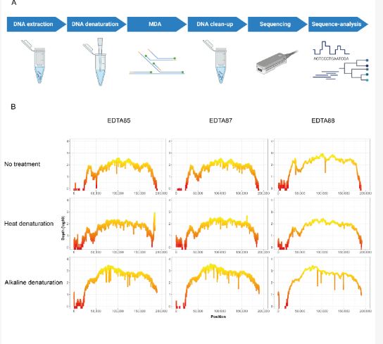 В данной работе представлен новый подход к полногеномному секвенированию вируса АЧС, основанный на методе Multiple displacement amplification (MDA) с использованием ДНК-полимеразы Phi29. Продемонстрировано, что применение всего семи праймеров в сочетании со стадией денатурации ДНК позволяет получить почти полный геном вируса АЧС из ДНК, выделенной из образцов крови инфицированных свиней с добавлением ЭДТА. Также показано, что предварительная обработка ДНК перед MDA увеличивает общее покрытие генома и процент вирусных прочтений, который был выше при использовании щелочного лизирующего буфера. Этот новый метод полногеномного секвенирования может быть использован в качестве быстрого и избирательного метода для определения геномной последовательности вируса АЧС и других ДНК-содержащих вирусов.