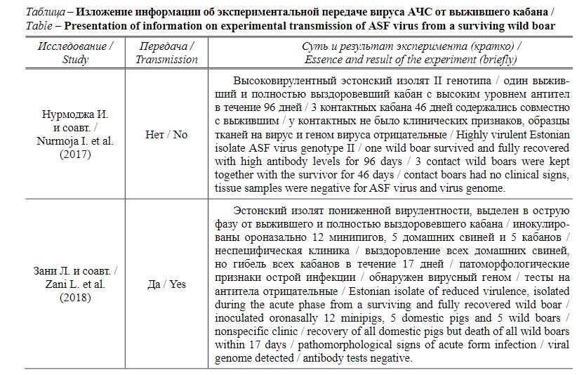 Для окончательного установления вклада серопозитивных выживших кабанов в поддержание циркуляции вируса требуется дальнейшее изучение механизмов передачи вируса, иммунного ответа и вирусоносительства. О подострых, хронических и бессимптомных формах течения АЧС полезно знать всем заинтересованным сторонам (ветеринарным специалистам, охотникам, фермерам и др.), что улучшит понимание текущей ситуации по АЧС.