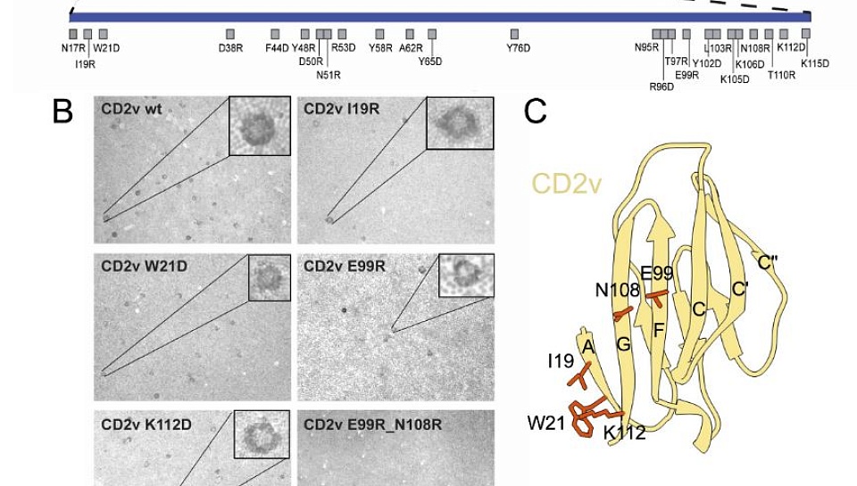 Африканская чума свиней — это опасное инфекционное заболевание, которое оказывает серьёзное негативное влияние на продовольственную безопасность во всем мире. Возбудителем болезни является вирус африканской чумы свиней (ВАЧС/ASFV), который представляет собой крупный вирус с двухцепочечной ДНК. В геноме вируса обнаружено более 150 открытых рамок считывания, функции многих из которых до сих пор не изучены. На поверхности инфицированных клеток экспрессируется гликопротеин CD2v, который кодирует ген EP402R. Этот белок является единственным известным вирусным белком, входящим в состав внешней оболочки вируса. Белок CD2v отвечает за связывание эритроцитов с клетками и вирионами вируса. Известно, что взаимодействие белка CD2v с эритроцитами способствует длительному пребыванию вируса в крови, что облегчает его передачу от одного животного к другому.