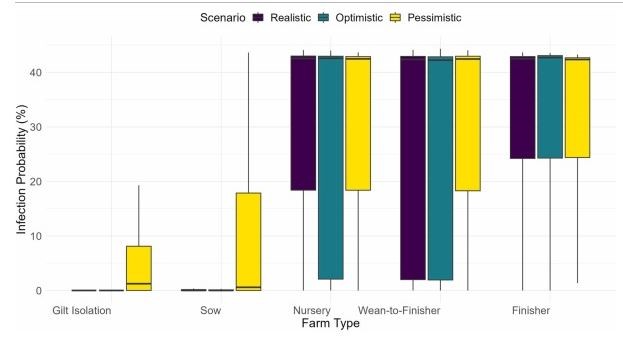 Исследование представляет важный вклад в область биобезопасности свиноводства, оценивая влияние различных режимов дезинфекции транспортных средств на распространение вируса РРСС между фермами. С использованием данных в реальном времени и сетевого моделирования были проведены сравнительные анализы различных сценариев. Полученные результаты демонстрируют ключевую роль частоты дезинфекции транспорта в снижении риска передачи инфекции в многоотраслевых системах производства свинины. Хотя в рамках исследования не рассматривался сам процесс дезинфекции, были подтверждены важность его регулярности и интенсивности. Полученные результаты формируют научную основу для разработки и внедрения целенаправленных мер по минимизации рисков заноса инфекций и оптимизации профилактических мероприятий в свиноводческих хозяйствах, позволяют идентифицировать ключевые пути передачи инфекции и разрабатывать стратегии для эффективного снижения рисков её распространения, а также могут быть использованы для оптимизации производственных процессов.