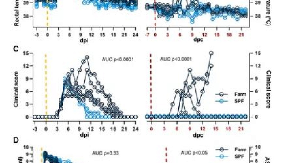 Ранее было продемонстрировано, что заражение умеренно вирулентным полевым штаммом ASFV «Эстония 2014» протекало менее тяжело у свиней, свободных от специфических патогенов (SPF), по сравнению с фермерскими свиньями. Отличия наблюдались в составе микробиома кишечника и уровне базовой иммунной активации. Как было установлено ранее при внутримышечном введении вируса, SPF-свиньи проявляли более высокую устойчивость к перорально-назальному заражению штаммом «Эстония 2014», в то время как фермерские свиньи демонстрировали повышение температуры и выраженные клинические признаки болезни. Тем не менее, все животные перенесли инфекцию, а виремия сохранялась в течение примерно 4 месяцев. Далее обе группы были повторно заражены вирулентным штаммом ASFV «Армения 2008». SPF-свиньи оказались полностью защищены от болезни и практически не проявляли виремии при повторном заражении. В отличие от них, у фермерских свиней наблюдалась высокая виремия, значительное повышение уровня провоспалительных цитокинов, выраженные клинические симптомы, а также летальный исход у 40% животных.