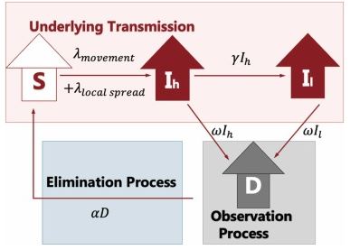 Для оценки динамики передачи РРСС до внесения изменений в законодательство в 2023 году и прогнозирования эффективности мер контроля была разработана стохастическая компартментная модель, учитывающая взаимодействие между стадами. Модель включает следующие компартменты: