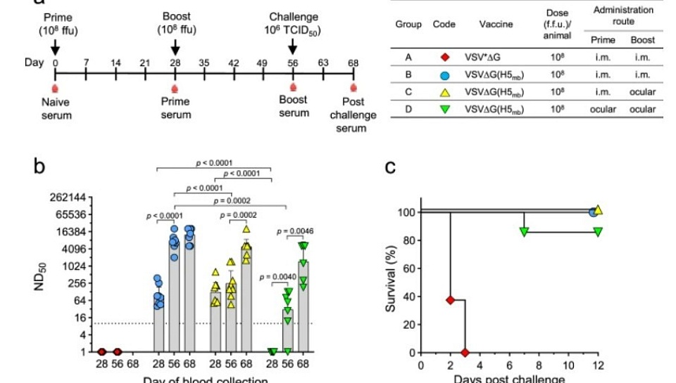 В рамках настоящего исследования была проведена оценка эффективности вакцины на основе репликона вируса везикулярного стоматита (VSV), экспрессирующего гемагглютинин (HA) изолята вируса гриппа птиц H5N1 2022 года, принадлежащего к кладе 2.3.4.4b, у различных видов птиц, содержащихся в двух швейцарских зоопарках. Целью исследования было определение интенсивности и продолжительности гуморального иммунного ответа у птиц различных видов в течение 400-дневного периода.